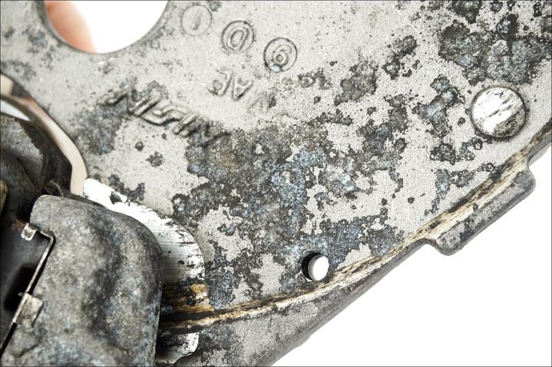 Pinza integra ma con segni di uso e scoloriture varie. Supporto pinza con segni di ossido